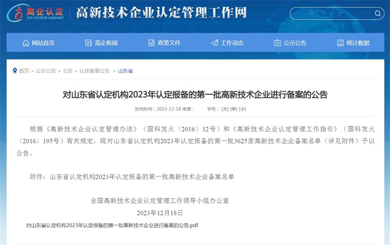近日,全國高新技術(shù)企業(yè)認(rèn)定管理工作領(lǐng)導(dǎo)小組辦公室公示了山東省認(rèn)定機構(gòu)2023年認(rèn)定報備的第一批高新技術(shù)企業(yè)名單,山東同泰維潤食品科技股份有限公司再次通過認(rèn)定,被授予“國家高新技術(shù)企業(yè)”稱號。