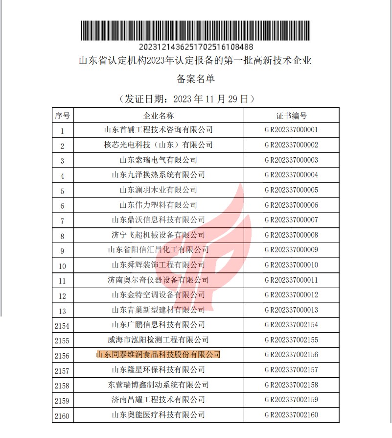 近日,全國高新技術(shù)企業(yè)認(rèn)定管理工作領(lǐng)導(dǎo)小組辦公室公示了山東省認(rèn)定機構(gòu)2023年認(rèn)定報備的第一批高新技術(shù)企業(yè)名單,山東同泰維潤食品科技股份有限公司再次通過認(rèn)定,被授予“國家高新技術(shù)企業(yè)”稱號。